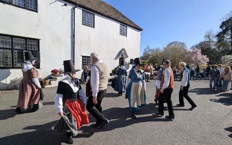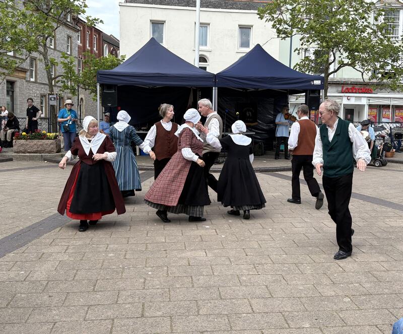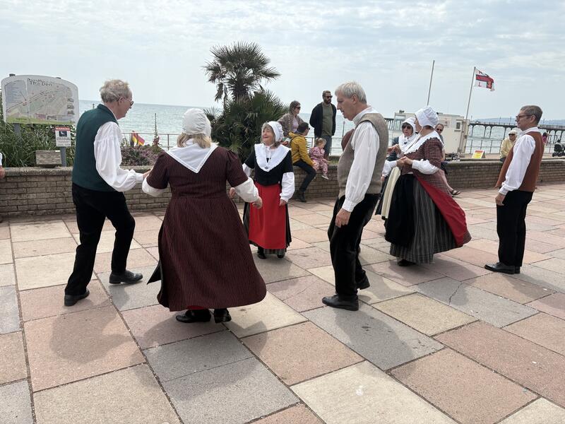 Then a short break before the 10th May found us at another regular...the Tredegar House Folk Festival. Yet more good weather which brought out the crowds over the weekend. We danced on the Saturday and did a spot in both dance marquees. As well as the free dance displays, there were plenty of concerts, workshops, free entertainment, real ale bar, food and most importantly....sunshine. As a consequence of having a local Hungarian dance group at the festival, GG was proud to be asked to take part in a Welsh/Hungarian day at Lisvane Memorial Hall in Cardiff, celebrating our two cultures. It was a wonderful afternoon and we were entertained by singer Daf Jones and Hungarian musicians and dancers. GG demonstrated 3 dances, then got the audience on their feet for a twmpath dance. Colourful crafts were on sale as well as tasty Hungarian food. It is many years (well before Covid) since we have been away as a group to a weekend festival, so we thoroughly enjoyed our time at the Teignmouth Folk Festival in June. This is mainly a Morris dancing event, with some Appalachian sides and a couple of extras – of which GG was one. The forecast was for it to be exceptionally hot (which would have been unbearable for the ladies in their long woollen costumes), but fortunately it was cooler than we feared, and we even got rained on and didn’t mind! We danced at 3 spots along the promenade on Saturday, plus we had the honour of the 45 minute guest performance at the main venue (The Triangle)...all dance venues are outdoors. On Sunday we did 2 spots before the lunch break, and then made our way back to South Wales. Quite a few of us stayed at the lovely Cliffden Hotel in Teignmouth. It has extensive grounds which, happily for us, meander down to exactly the part of the promenade where Saturday’s procession started. It also has an excellent indoor swimming pool.